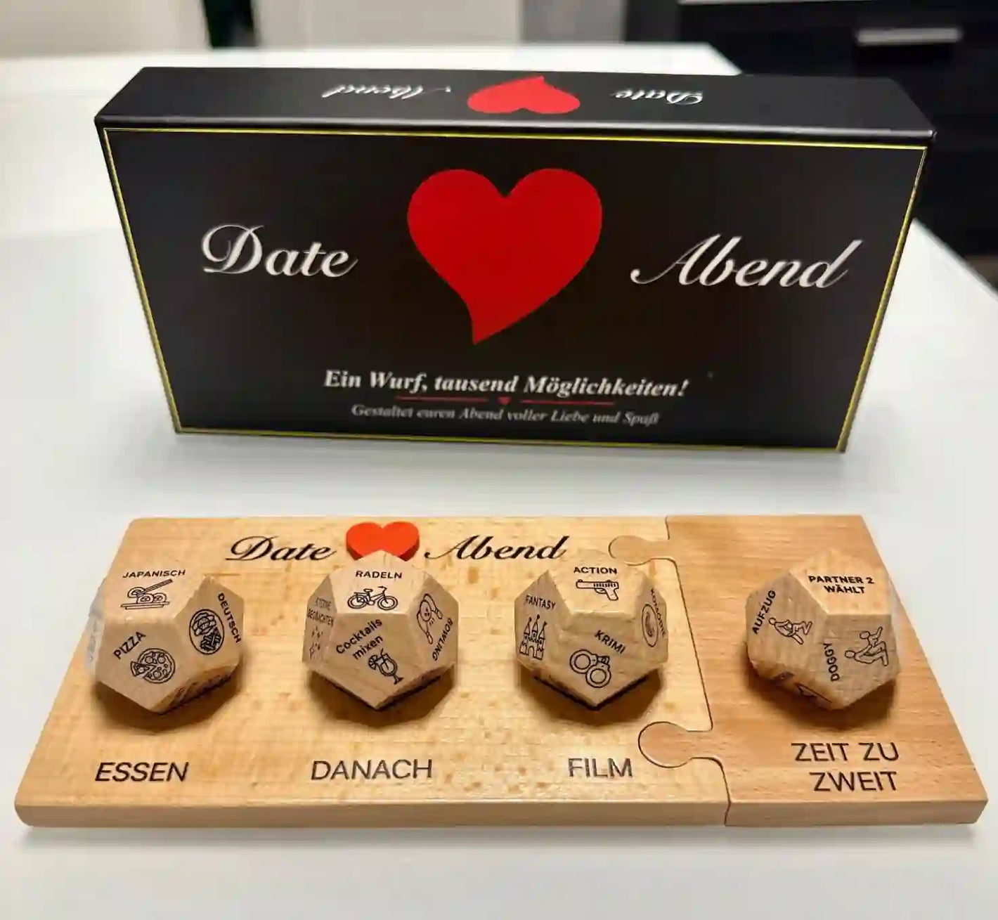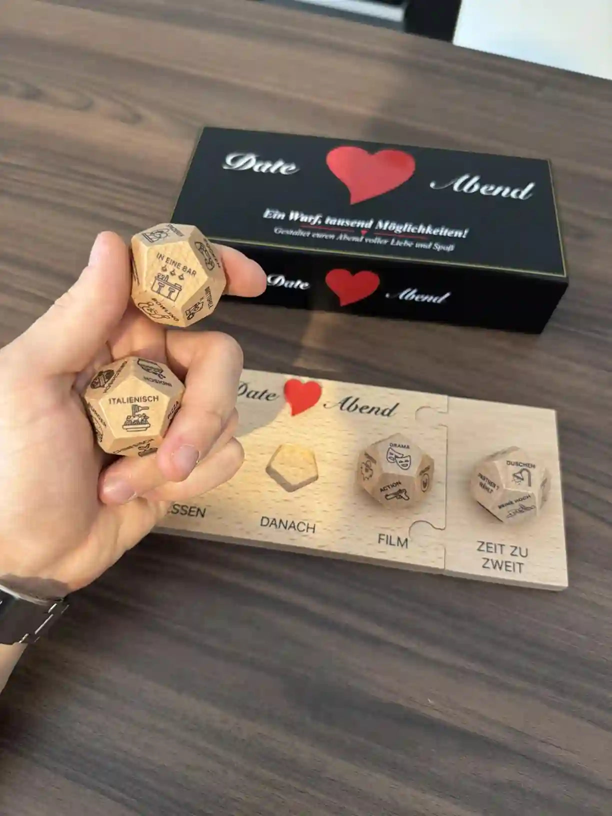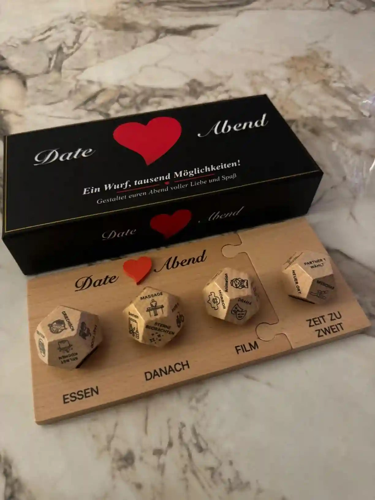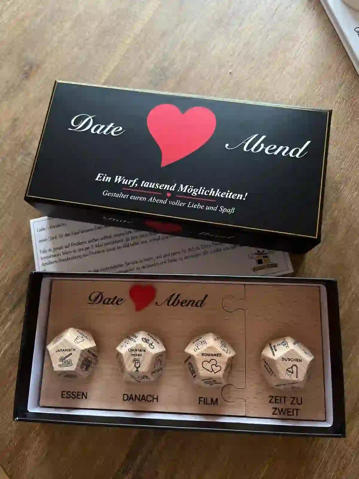 In deinem liebevoll gestalteten Set findest du vier hochwertige Holzwürfel und ein edles Holzbrett als Ablage. Verpackt wird alles in einer eleganten Geschenkbox. Die Würfel offenbaren spannende Kategorien wie Essen, Aktivitäten, Filmgenres und den gemütlichen Ausklang des Abends – perfekt für ein abwechslungsreiches Date voller Nähe und schöner Momente.