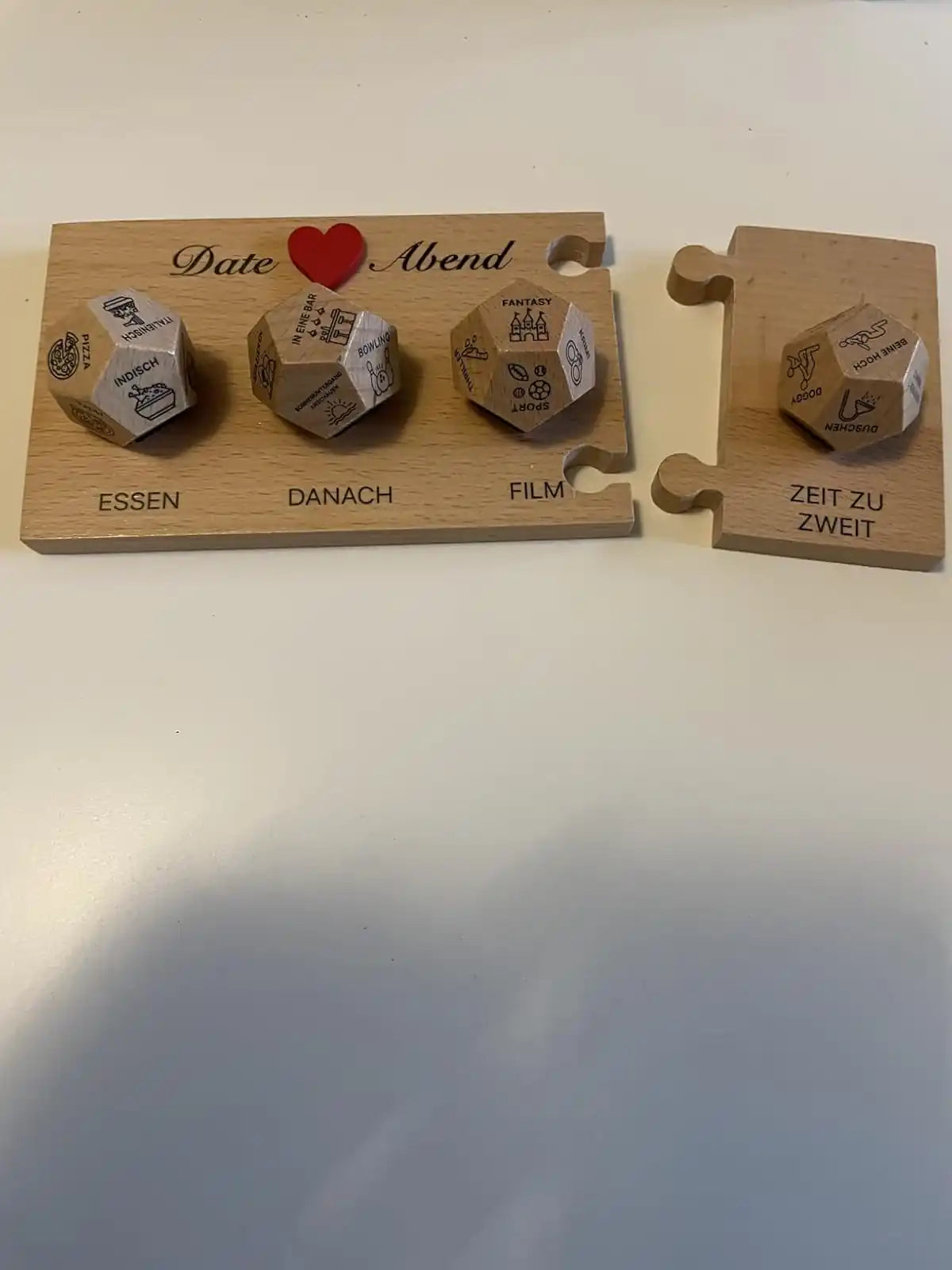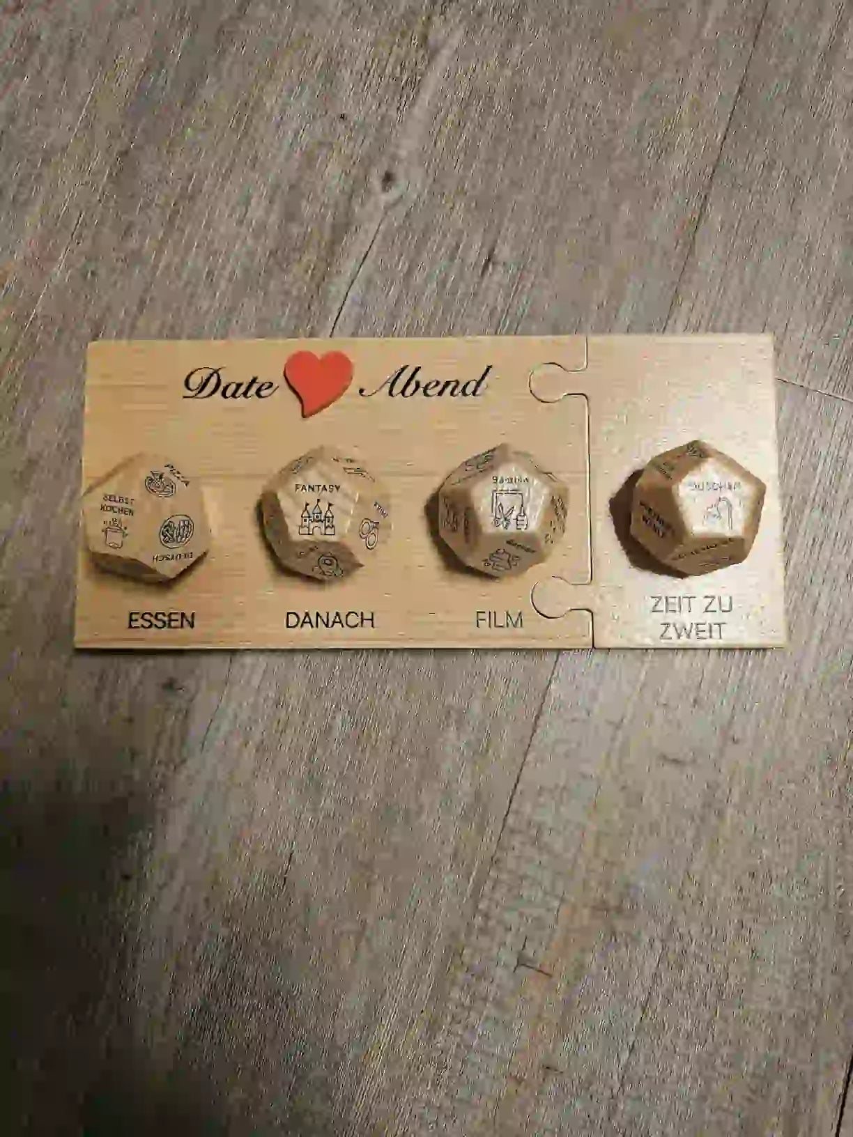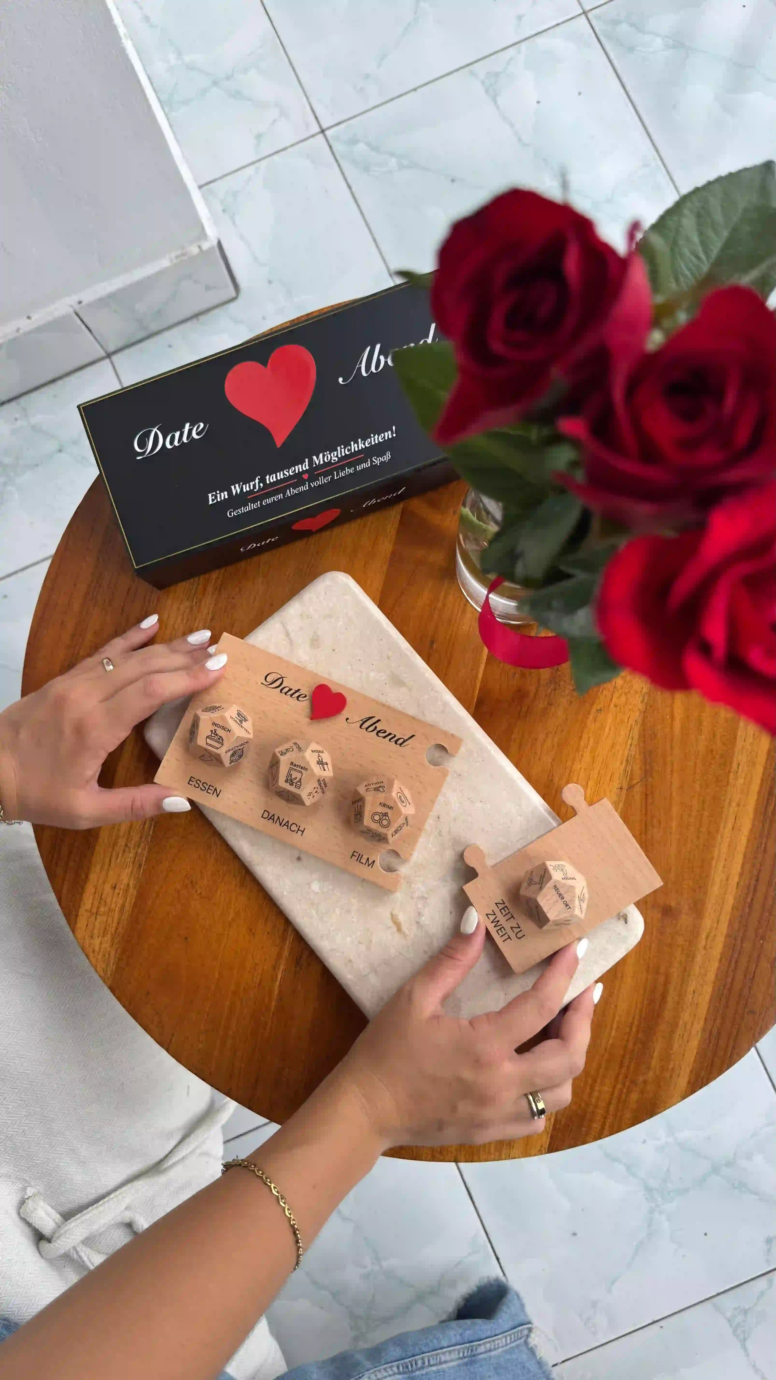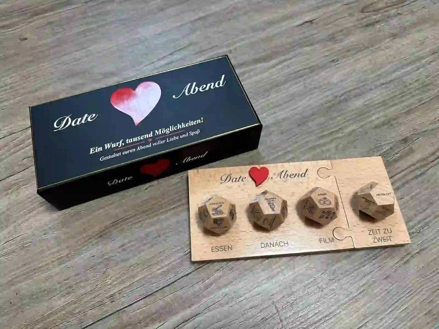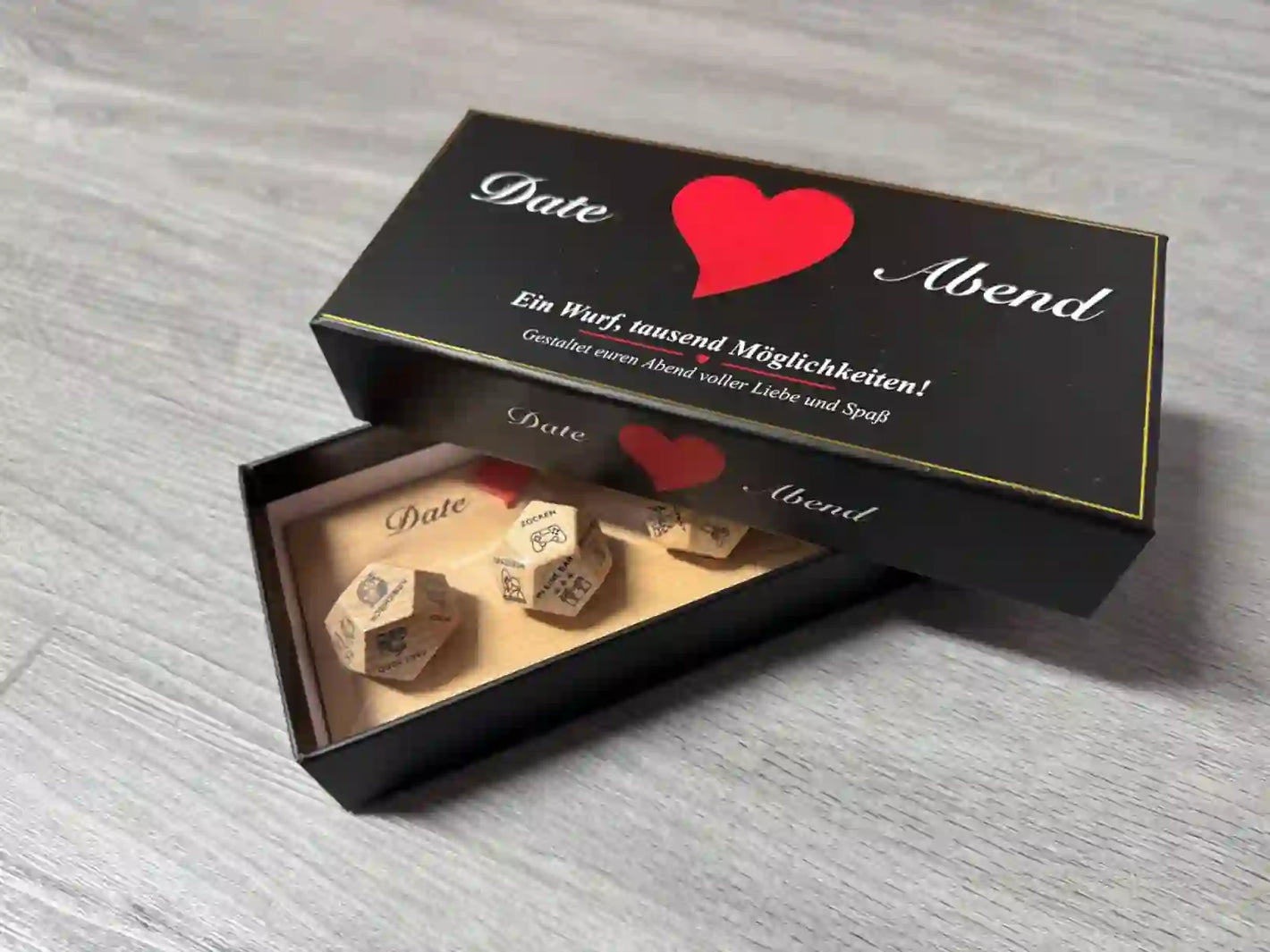 In deinem liebevoll gestalteten Set findest du vier hochwertige Holzwürfel und ein edles Holzbrett als Ablage. Verpackt wird alles in einer eleganten Geschenkbox. Die Würfel offenbaren spannende Kategorien wie Essen, Aktivitäten, Filmgenres und den gemütlichen Ausklang des Abends – perfekt für ein abwechslungsreiches Date voller Nähe und schöner Momente.