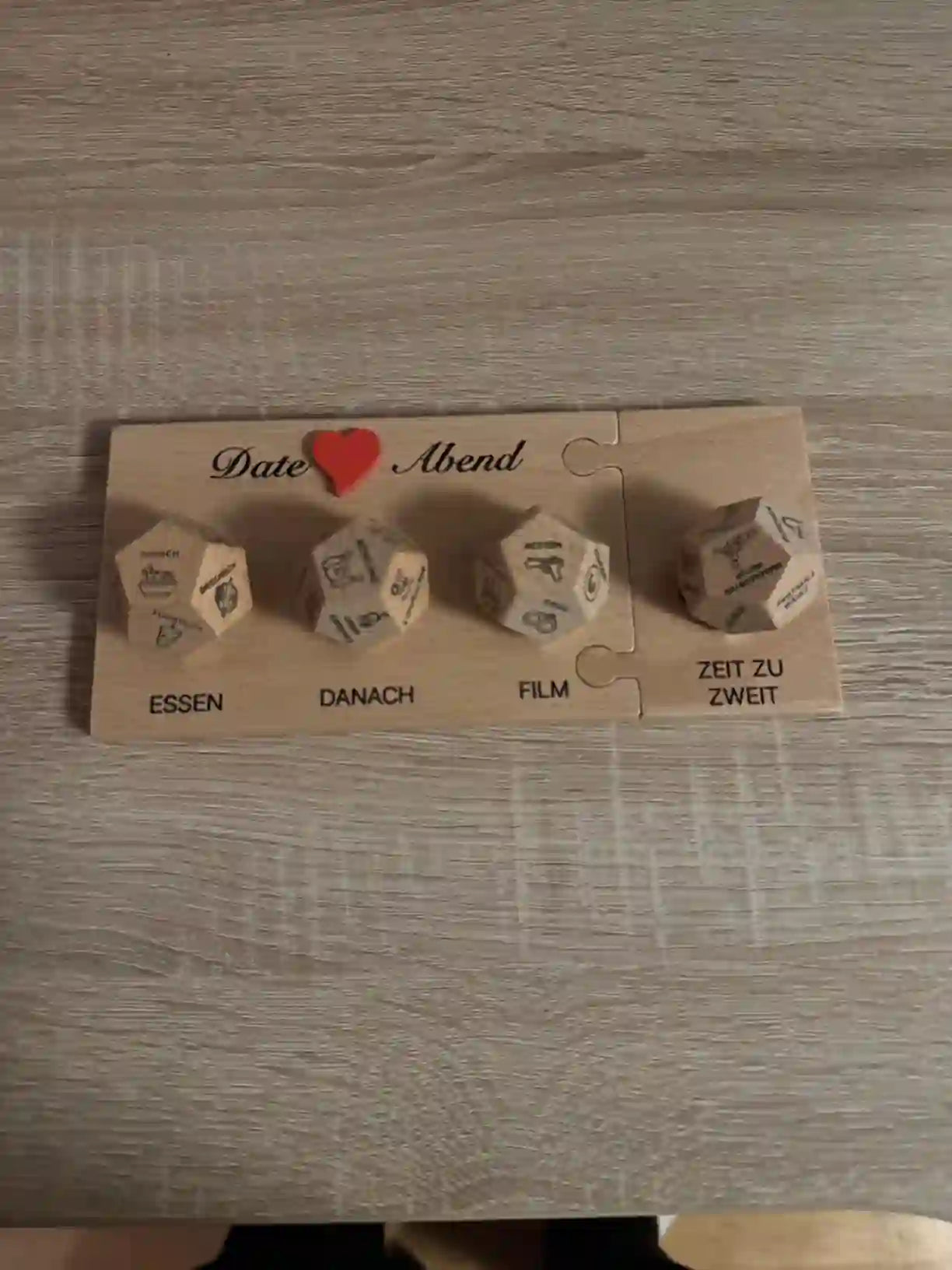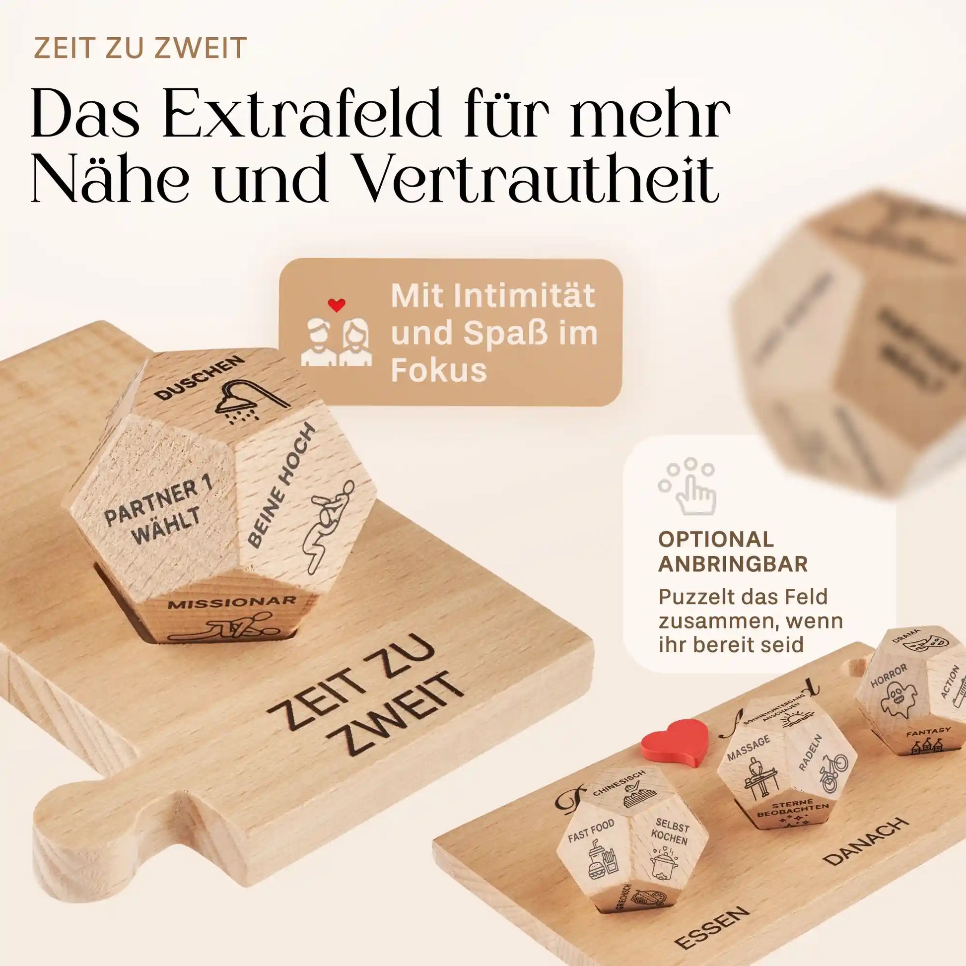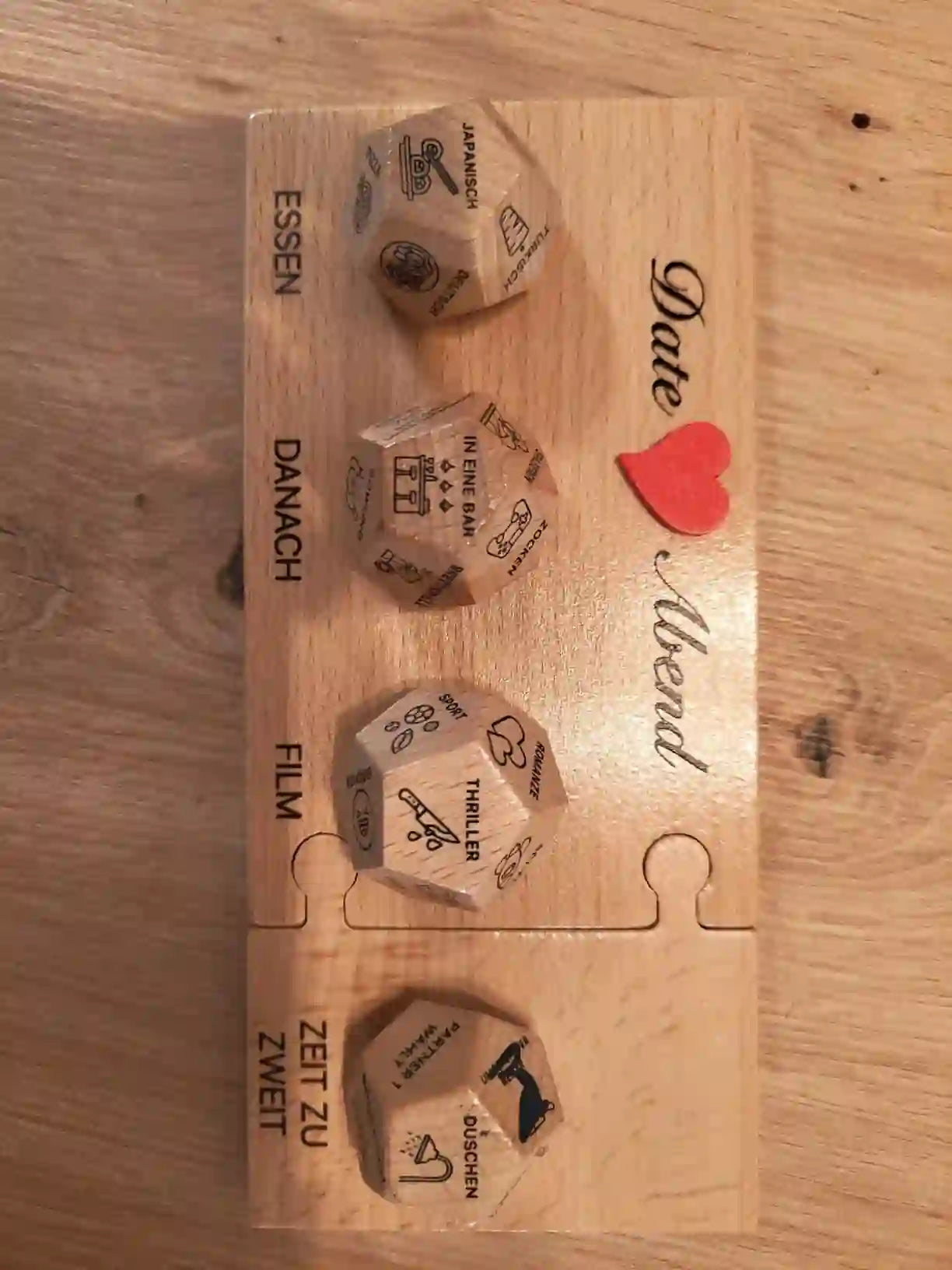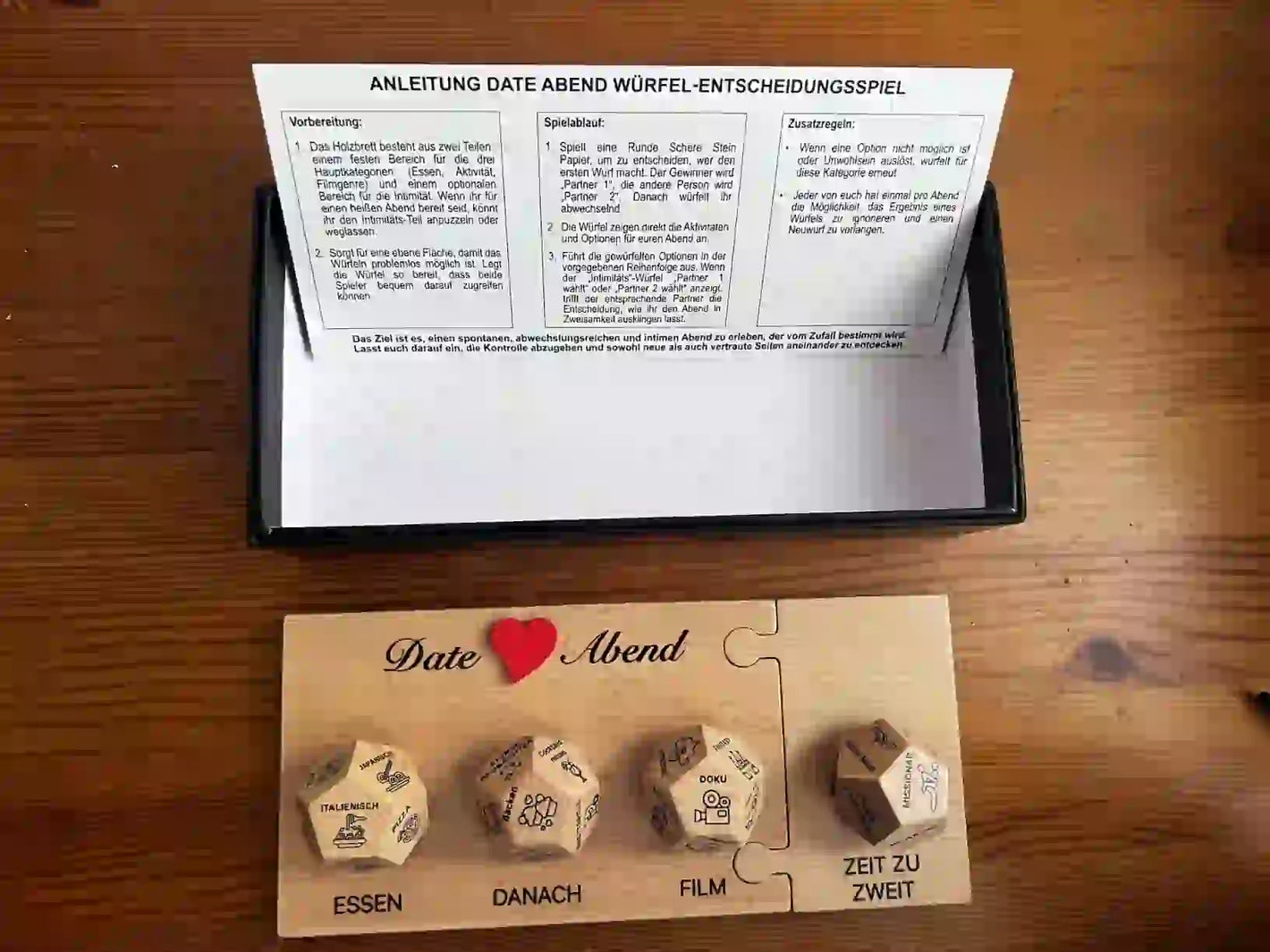 In deinem liebevoll gestalteten Set findest du vier hochwertige Holzwürfel und ein edles Holzbrett als Ablage. Verpackt wird alles in einer eleganten Geschenkbox. Die Würfel offenbaren spannende Kategorien wie Essen, Aktivitäten, Filmgenres und den gemütlichen Ausklang des Abends – perfekt für ein abwechslungsreiches Date voller Nähe und schöner Momente.