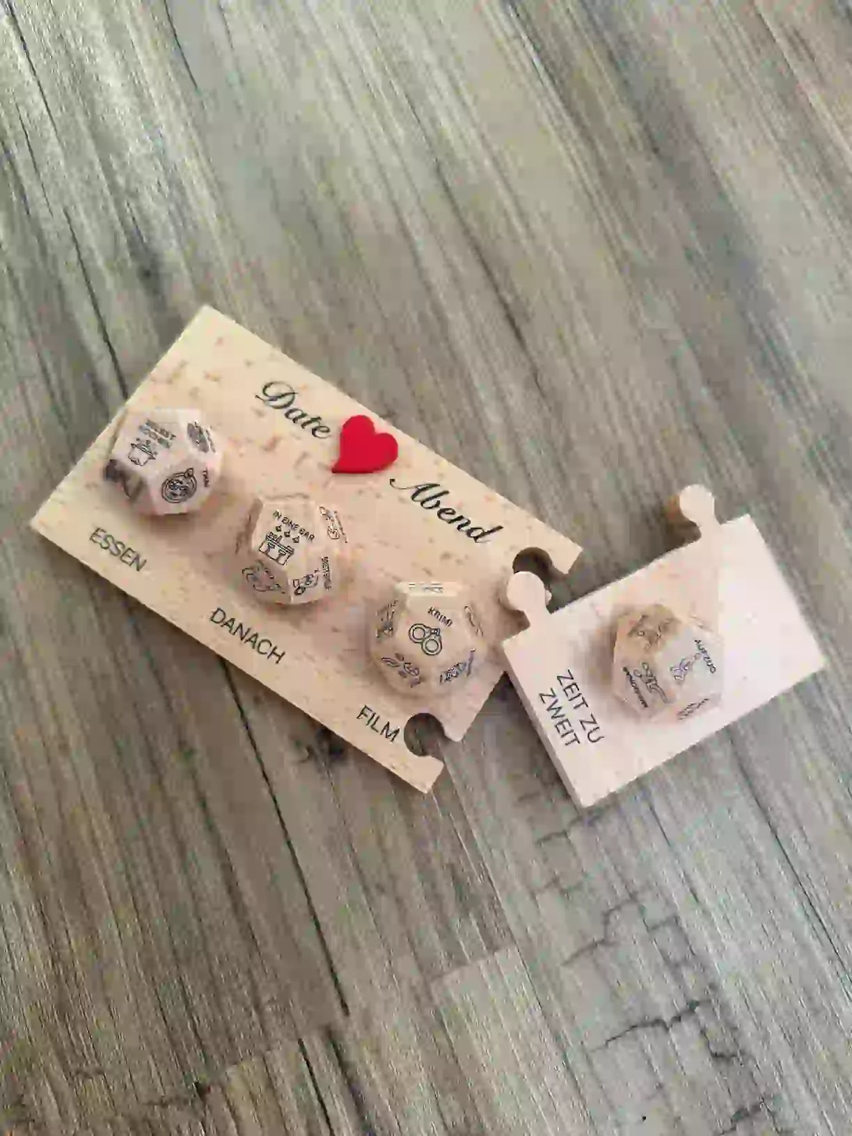 Es ist ganz einfach: Würfelt nacheinander mit den vier thematisch gestalteten Holzwürfeln – für Essen, Aktivität, Filmgenre und eine schöne gemeinsame Zeit zum Ausklang. Die Kombination der Würfelergebnisse schenkt euch ein einzigartiges Date voller Liebe, Spaß und Überraschungen.