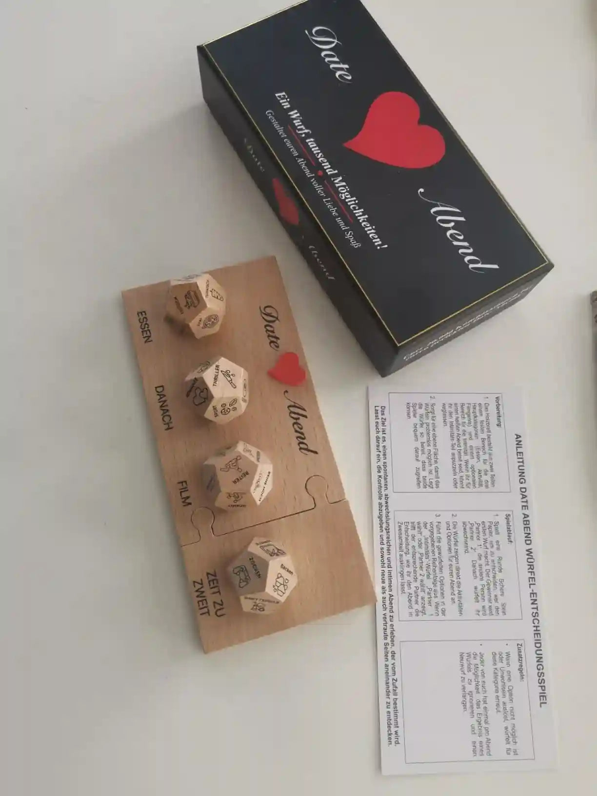 Wer sein Dating-Leben auffrischen möchte, ist hier genau richtig!Macht Spaß sich sein Dating zu würfeln!Qualität und Verarbeitung ist top, da kann man sich nicht beschweren!Ist auch ein super Geschenk, wenn jemand auf der Suche ist.Ich kann es weiter empfehlen!