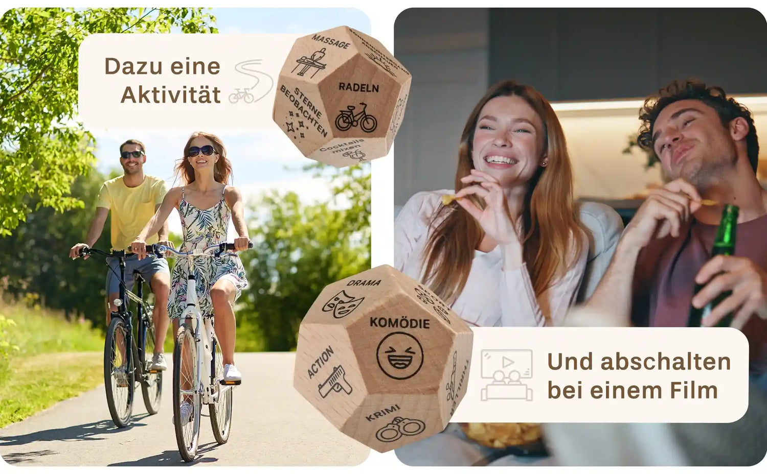 Kurz erklรคrt:ย 4 Holzwรผrfel liefern euch in Sekunden Ideen fรผrย Essen,ย Danach,ย Filmย &ย Zeit zu zweit. Jede Runde ist anders โ null Planungsstress, 100 % Quality-Time.